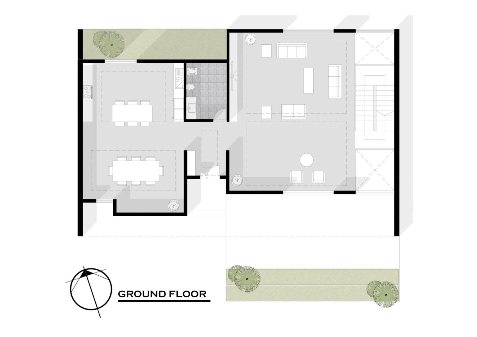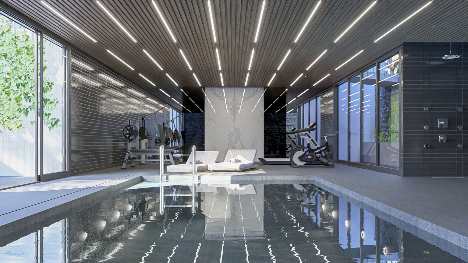 To optimize light control for the underground sports area, part of the landscape is intentionally recessed. This design allows for increased natural light while introducing a private sunken courtyard that enhances both the visual appeal and functionality of the space. Additionally, an overhanging concrete shell on the exterior plays a crucial role in controlling sunlight during the summer months, providing shading and contributing to the building’s energy efficiency.