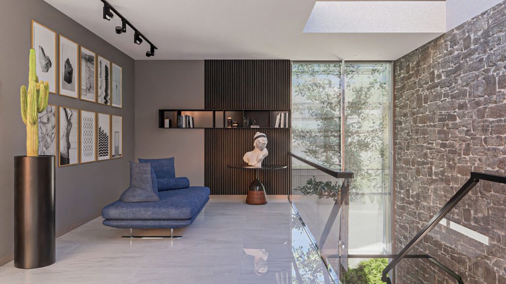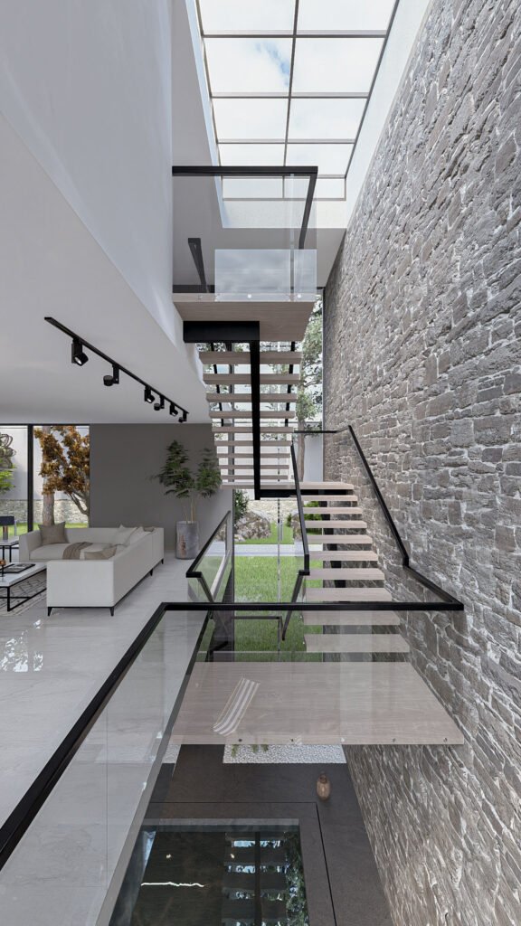 The vertical connection between three levels, enhancing the spatial flow within the interior